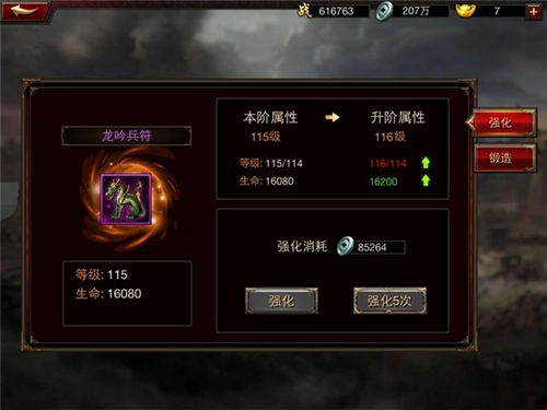 在游戏里,花费银两能够强化装备。装备强化后等级会提升,其属性加成的效果也会明显增强。一般来说,每次强化装备,强化等级都会提升一级;不过存在一定概率触发暴击效果,这样就能一次性提升2到3级的强化等级。