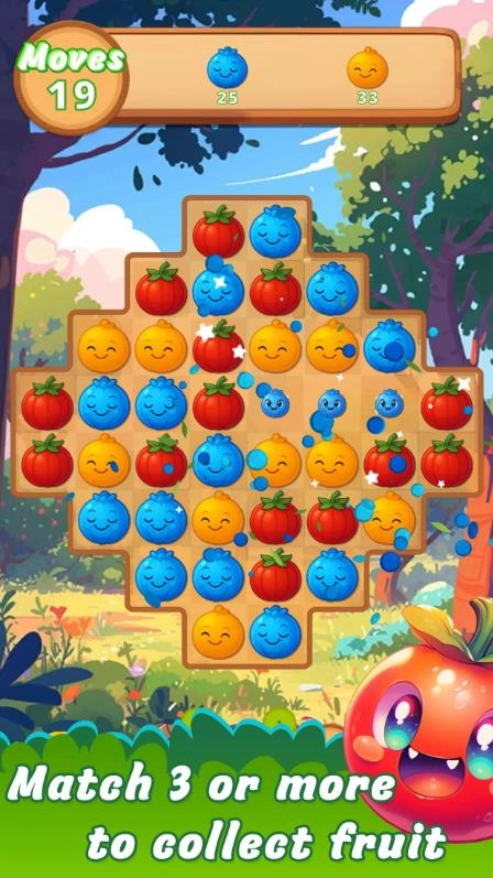 这是一款充满乐趣与挑战的水果主题三消益智游戏,在这个缤纷多彩的花园世界中,你将展开一段妙趣横生的果园探险旅程!游戏融合了传统三消的经典机制与创新的玩法设计,玩家需要通过滑动水果图块,将三个或以上相同种类的水果进行横向或纵向排列,即可完成消除并得分。无论是多汁的草莓,还是饱满的蓝莓,每一次完美的匹配都能带来令人上瘾的连锁反应,满屏绽放的水果特效定会让你欲罢不能!
