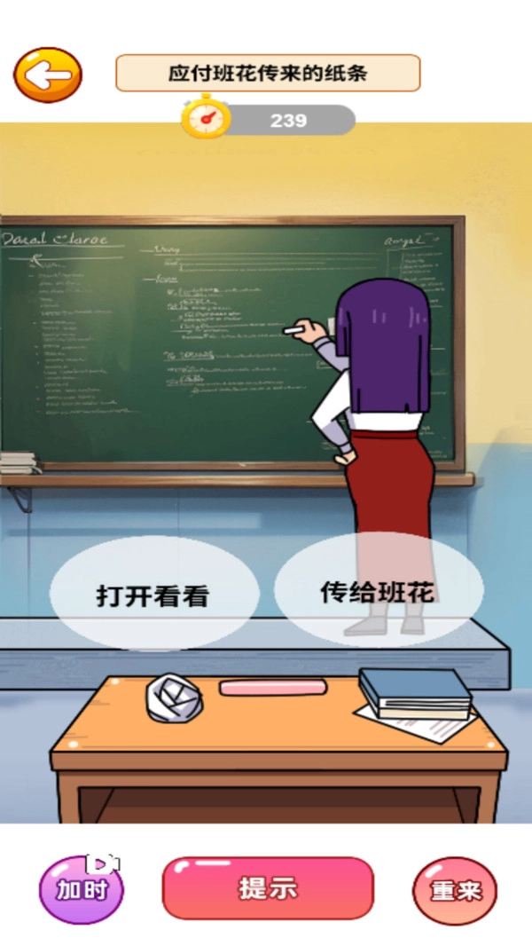 学姐变身是一款青春校园题材的趣味解谜游戏,在课堂场景里,面对班花传纸条等校园日常事件,根据标题选打开看看,传给班花等操作,不会就看答案或跳关,体验青春校园的轻松解压之旅,选择答案,需要快点哟。