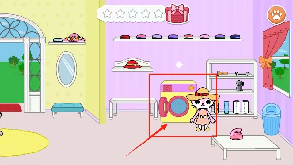 点击场景里的黄色洗衣机,将脏衣服放进去,它便会自动启动清洗程序。