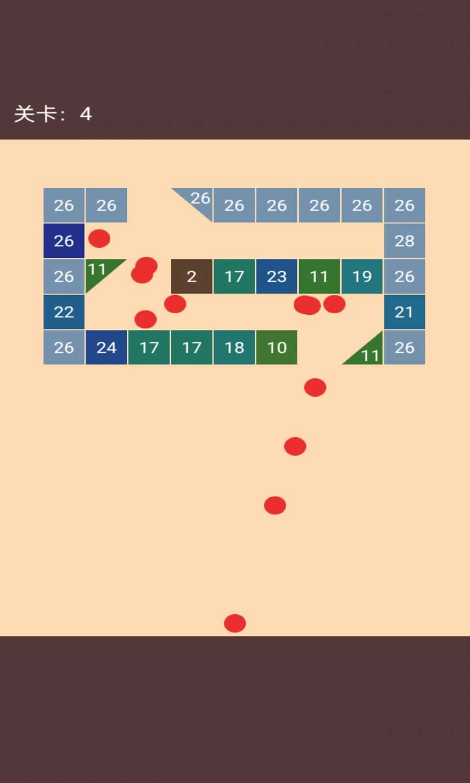 发射弹球:按住屏幕下方的弹球并拖动,以此调整发射角度;松开手指即可发射,弹球会沿着轨迹向上反弹。