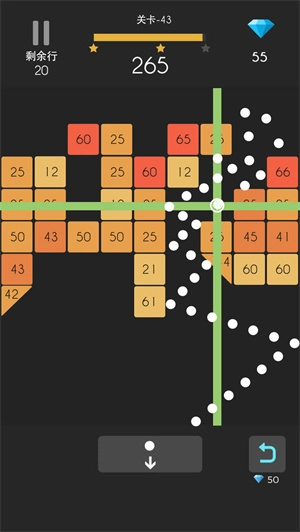 2、当所有圆球都落回地面后,上方的全部方块会整体下移一格。玩家需要在发射圆球时确定瞄准的路径,同时计算好它的反弹轨迹,尽可能让圆球在方块之间产生更多次的反弹,以便在方块移动到地面之前,快速消除屏幕上出现的所有方块。