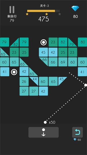 1、在游戏里,玩家要把屏幕下方的圆球顺着瞄准线弹射到屏幕中间那些标有不同数字的方块上,使圆球在多个方块和墙壁之间持续来回反弹,直到它碰到地面。圆球每和方块碰撞一次,方块上的数字就会减一,等方块的数字变成零,这个方块就会消失。