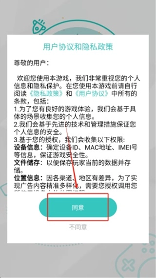确认条款:启动游戏后,阅读并同意用户协议与隐私政策,点击“同意”进入主界面。