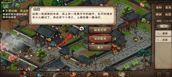 首先要去客栈,点击【定时歇息】并选择子时(半夜)休息,借助这一步把时间调整到深夜,为后续行动做准备。
