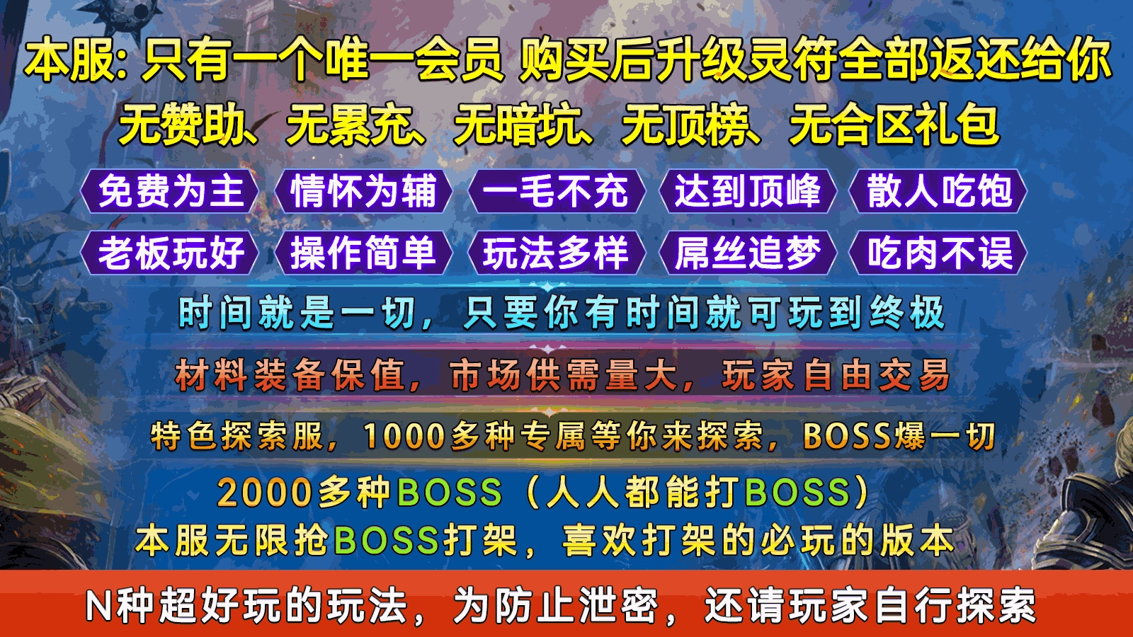 2、特色探索服,有1000多种专属内容等玩家探索,2000多种BOSS人人都能打,且BOSS爆一切。
