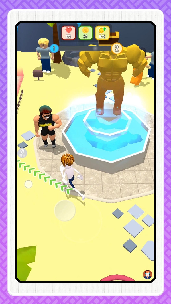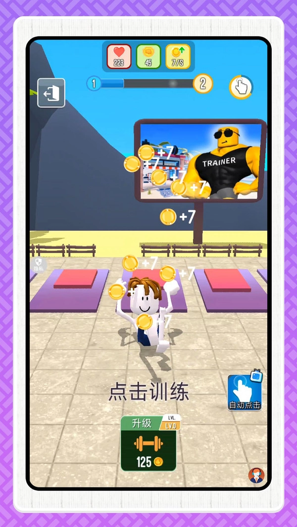 1、快速点击屏幕,让角色借助哑铃、垫子这类设备进行训练,每一次点击都会累积肌肉值,过程中还会有金币掉落。
