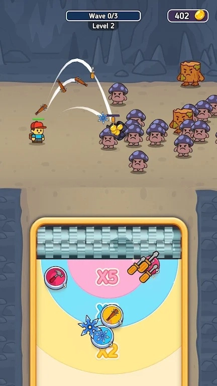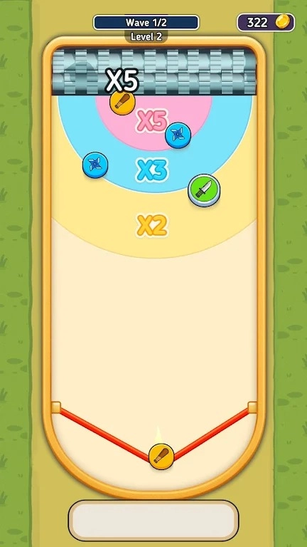 1. 玩家通过滑动屏幕或操作虚拟摇杆来调节弹射的力度与角度,把武器圆盘朝着BUFF区域弹射出去,若成功命中就能提升武器的数量。