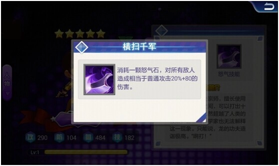 横扫千军:消耗一颗怒气石,对所有敌人造成20%+80的伤害