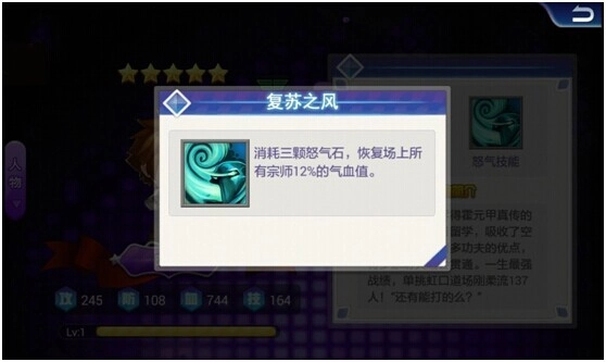怒气技能 复苏之风:消耗三颗怒气石,恢复场上所有宗师12%的气血