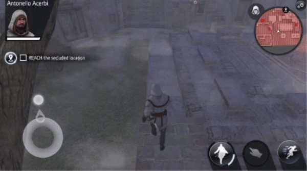 游戏设有两种操控模式:其一为类PC版的点击行走模式,其二是更适配手机操作的双摇杆模式。针对移动端体验进行了优化,攀爬、跳跃等动作均已简化,玩家靠近障碍物时便能自动触发相应动作;刺杀操作也更为直观,点击敌人头部上方的骷髅图标即可完成刺杀。