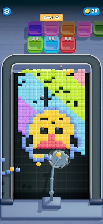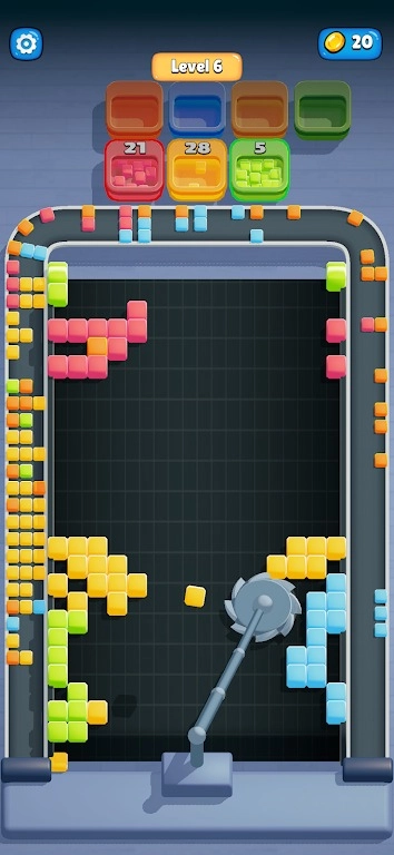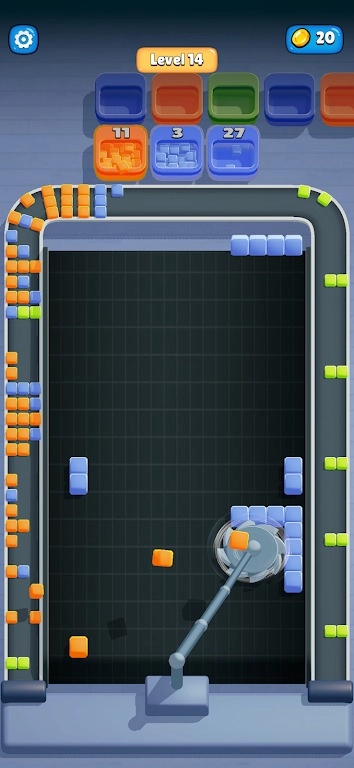 这是一款以切割消除为核心玩法的闯关游戏,玩家要操控底部的切割机,击碎传送带上的彩色方块,从而达成关卡目标。