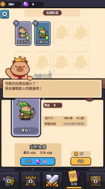 1、根据关卡地形部署不同职业的水豚英雄。 2、收集资源用于强化英雄、升级技能、解锁新能力。 3、完成挑战模式和日常任务,提升综合战力。