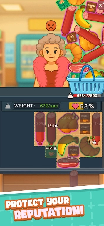 1.玩家将扮演一名收银员,面对堆满商品的柜台,需要通过合并消除来快速完成结算,避免顾客排队等待。