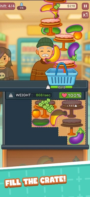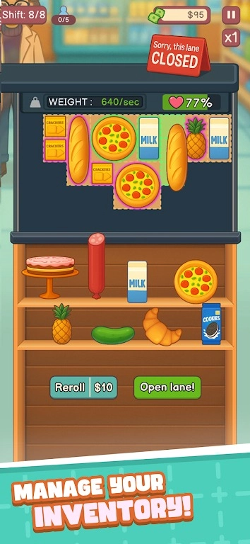 2.游戏融合了空间规划、时间管理和合并消除三大元素,玩家需要在有限的柜台空间内,合理摆放不同尺寸的商品。