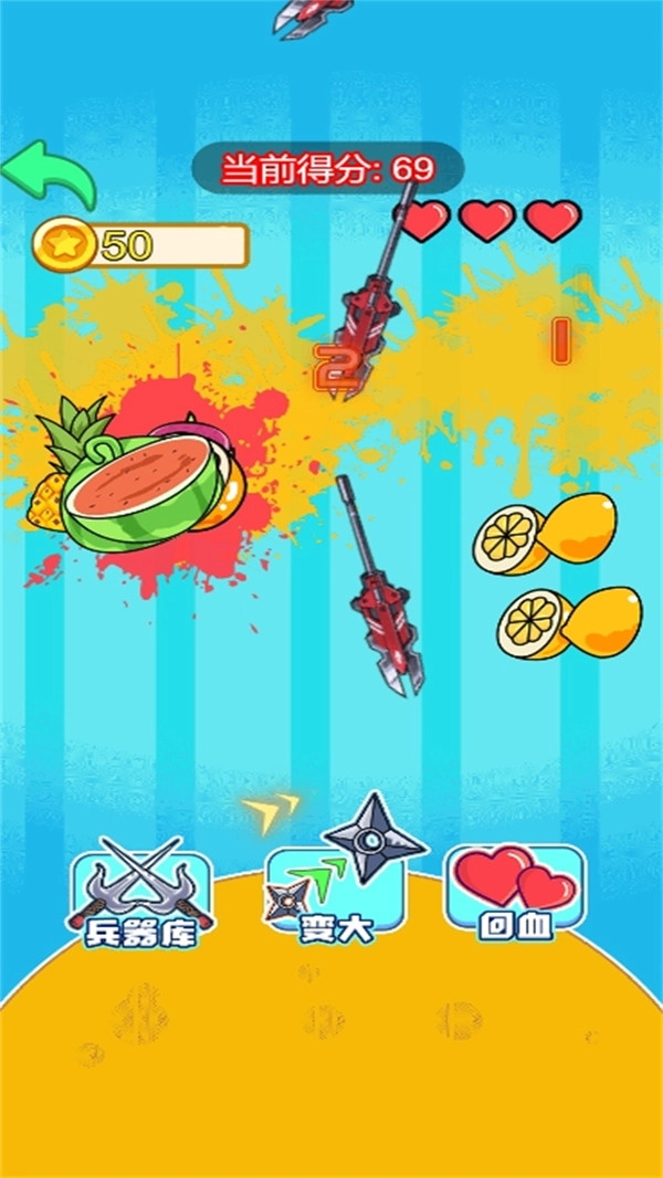 在游戏进行时,水果会持续被抛向空中,划出一道道优美的弧线。