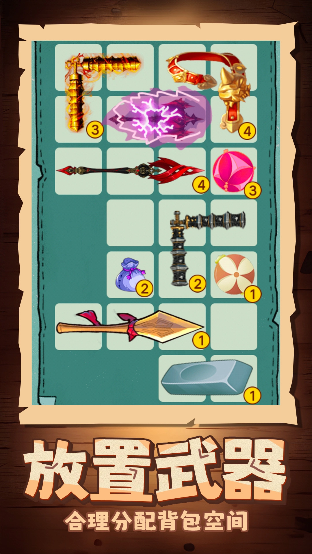 3. 不同武器的攻击方式各有特点,在背包里占据的空间形状也不一样,玩家需要对背包空间进行合理规划,让武器组合更加优化。