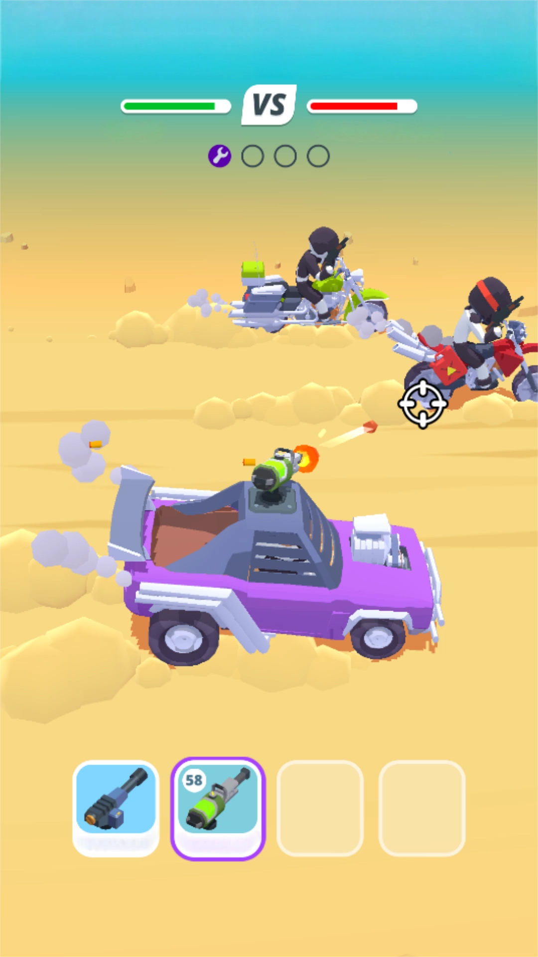 1、驾驶跑车驰骋于沙漠赛道,借助车载武器对敌方车辆发起攻击,同时灵活规避敌人的袭击,全力争夺首个冲过终点线的机会。