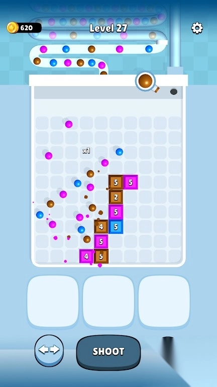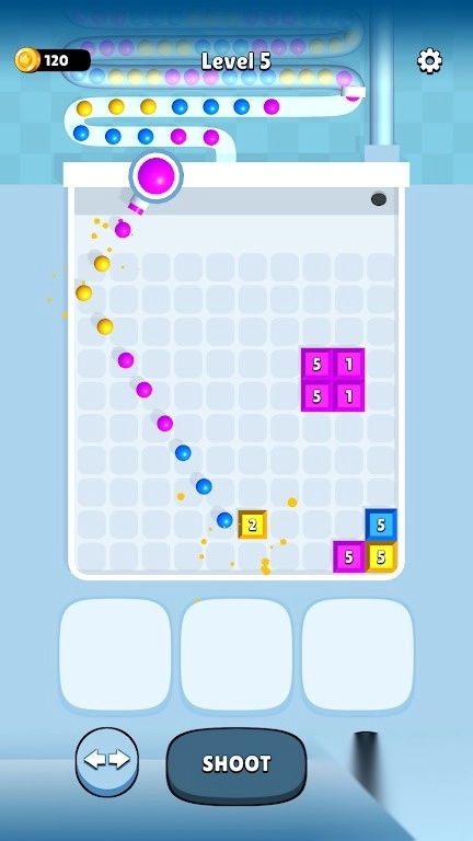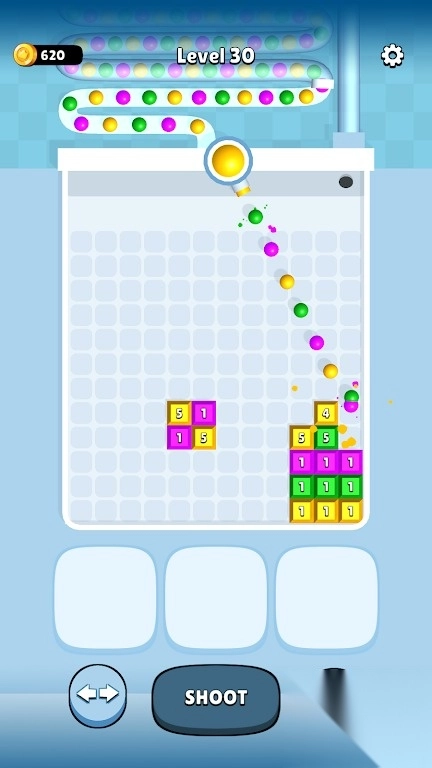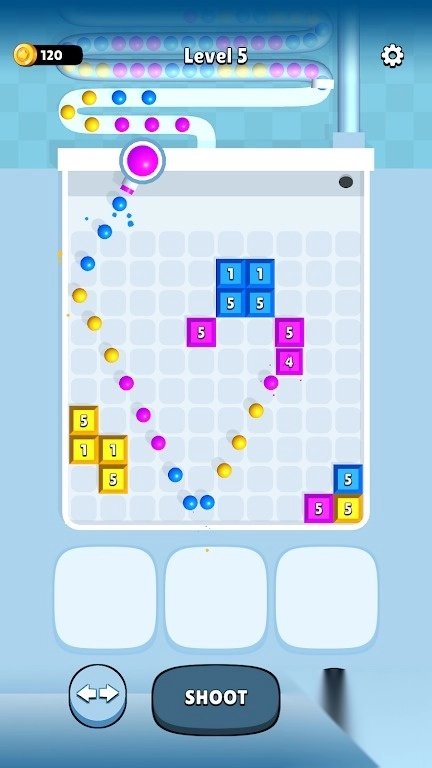 这是一款融合物理弹射机制与数字消除玩法的游戏。玩家发射彩色小球去撞击带有数字标识的方块,当方块上的数字降至零时,该方块就会被消除。
