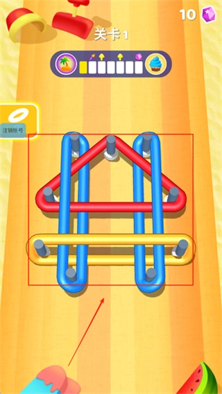 3、每条彩绳都得完整拉直,并且挂到对应颜色的钉子上,这样才算完成。等所有彩绳都正确归位后,关卡会自动判定通过,然后进入下一局。