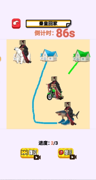 1、进入游戏选择关卡,比如帮助秦始皇回家,你需要画线将秦始皇和对应的家连接起来。