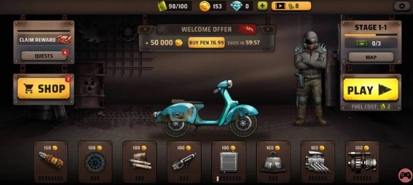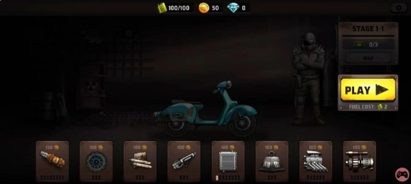 3、收集金币和强化道具,升级摩托车性能和武器装备。