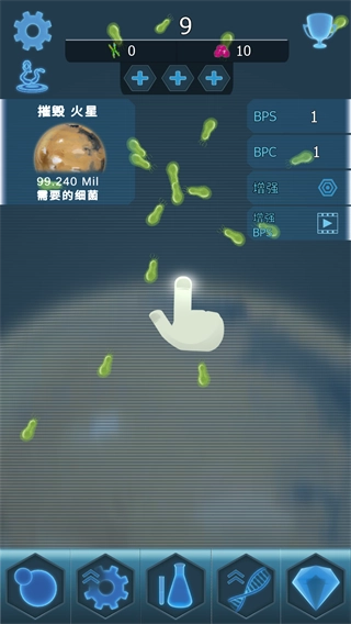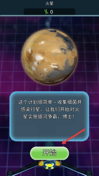2、在游戏进行时,你可以通过点击屏幕来收集绿色细菌,以此积累用于感染火星所需的资源。