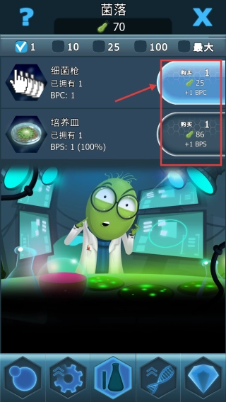 3、进入菌落界面后,可使用已收集的细菌购买细菌枪、培养皿等道具,以此提升BPC与BPS数值。