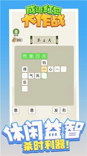 成语大作战是一款最近非常火爆的休闲益智,玩家们可以在成语大作战中体验到新版本上线的模式玩法。多样化的游戏关卡设计,来进行这个精彩的内容开始游戏,玩家要猜对成语才算过关,很是不错的一款游戏,各种类型的成语都有,你们只要来闯关就是可以来获得红包的,只要猜成语就能获取奖励,玩家们可以邀请好友一起加入到成语大作战当中。