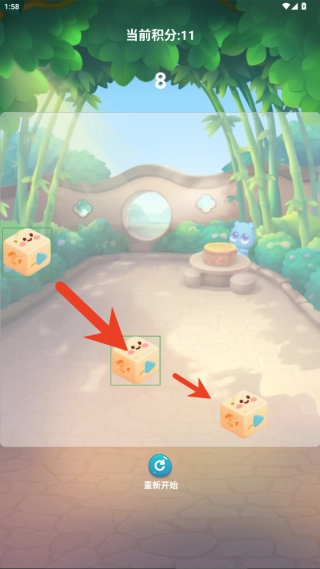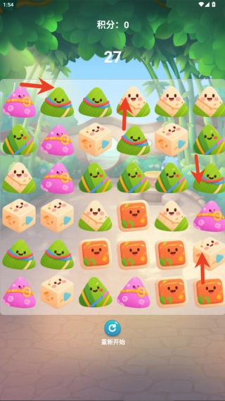 3、观察屏幕上粽子的排列布局,规划好优先消除的粽子组合,连接3个及以上相同的粽子即可完成消除。需要留意的是,部分绿色粽子看起来比较相似。