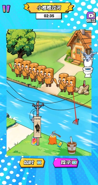 3、点击一根小棍,把它放进马桶里,马桶会把这根小棍冲到河的对岸去。
