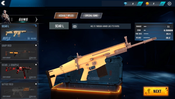 3.玩家能够在战斗过程中解锁并升级数十款武器,涵盖突击步枪至狙击枪等不同类型,每一款武器都具备别具一格的后坐力、射速以及伤害参数设定。