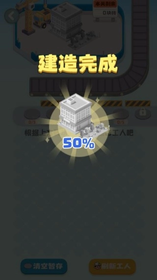 1、当所有需要的砖块都搬运完成后,工人就会自动开始建房,玩家只需要等待建造过程结束,完成关卡目标后就能解锁下一关,朝着搭建别墅、小镇的目标继续前进。