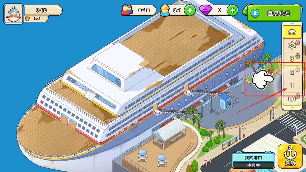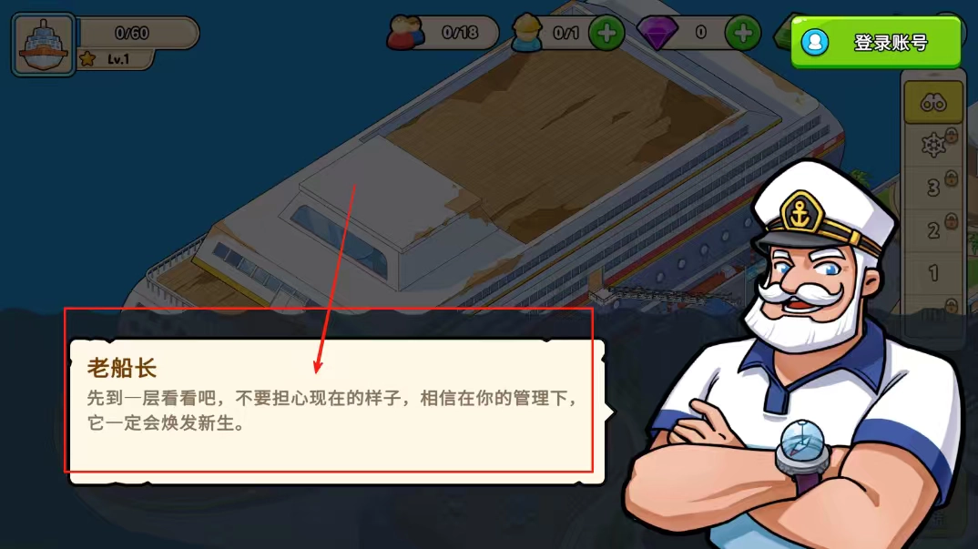 2、老船长吩咐你去一层查看,背景里的游轮比较破旧,点击右侧楼层数字1-3或者登录账号就能进入。