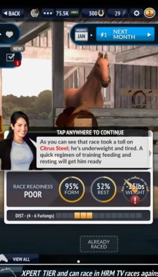 从挑选小马驹、安排日常训练,到参与各类激烈赛事、规划赛程安排,所有环节都由你全程把控。你可以培养出兼具速度、耐力与爆发力的优秀赛马,然后在HRM TV在线赛马中心参与实时PVP对决,这里每5分钟就会开启一场新赛事,随时等待你的挑战。