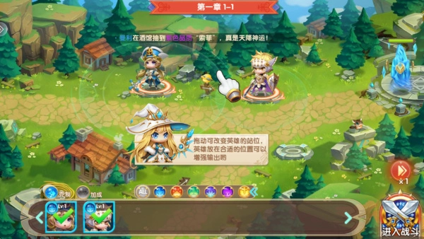 1、进入游戏后点击“开始探险”按钮,准备好迎接挑战。你可以通过拖动英雄调整站位,以提升他们的攻击输出。