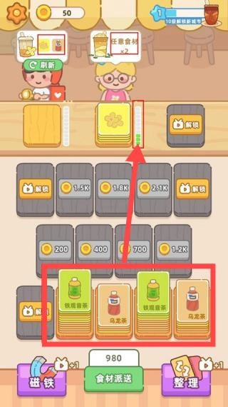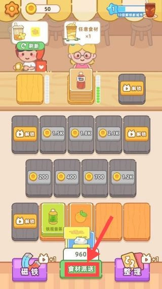 2、当材料不够时,可点击食材按键获取更多食材卡牌,以便制作更多奶茶。