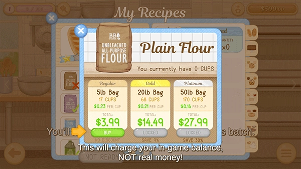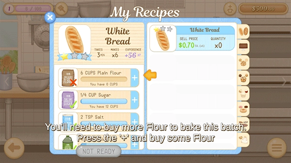 3、但制作面包的原料不够了,你需要买更多的面粉来烤这批面粉,按“+”键,买些面粉。