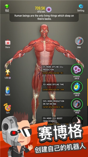 4、这些关联能让玩家直观了解人体运作的各类知识。玩家只需升级器官,就能获得挂机的细胞奖励;通过升级可提升器官带来的收益,也能点击屏幕获取收益。