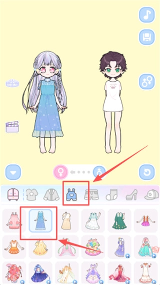 3、可以给紫色长发的女孩搭配蓝色连衣裙,也能为黑发男孩挑选上下装组合,操作过程中要留意红色箭头的指引提示。