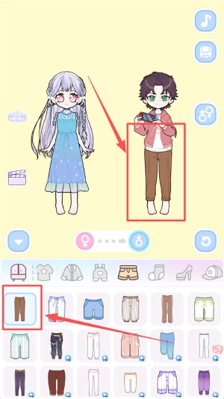 4、按照箭头所指的提示,为男孩挑选棕色的裤子,接着在服装栏里为其搭配合适的上衣和鞋子,从而完成整套造型的设计。