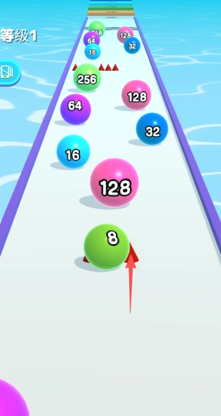 1、从1级开始,通过滑动屏幕操控球球持续滚动,让它和相同的球球合成。