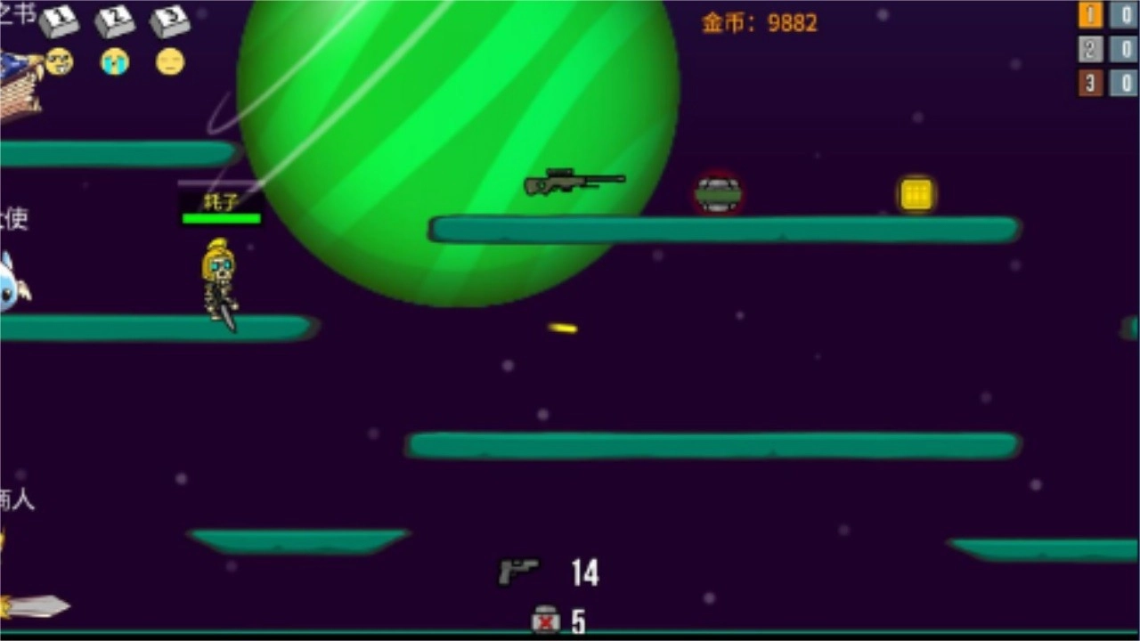 1、这是一款2D平台射击类休闲小游戏,采用轮盘操控移动,点击屏幕即可完成射击操作。