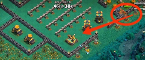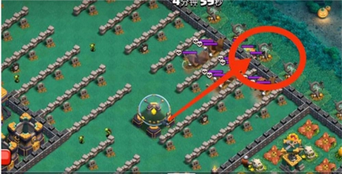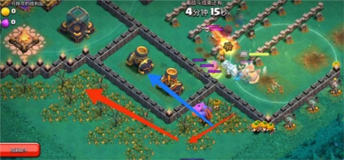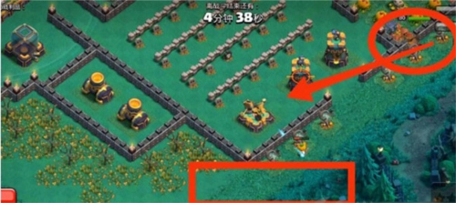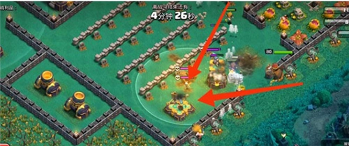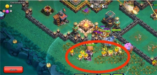 画面右侧被红色标记的区域内有两名女武神角色,她们会主动破坏墙体,墙体被破坏后会移动去攻击圣水储存容器。