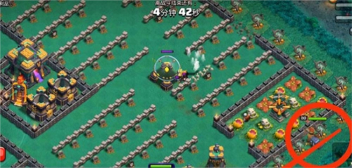 大部队在红色圈区域集结推进,等所有援兵都出动后,找准时机开启男王、永王的大招;剩下的两个隐形法术留着给女王拆大本时用。这时候基本就能稳拿三星了——要是前戏打得顺利,女王拆完大本还能剩半管血和大招,闰土也保有大招,四王都活着的话,右上角的地狱塔和两座特斯拉电塔完全能拆掉,哪怕旁边有不少骷髅和皇家幽灵也没问题。