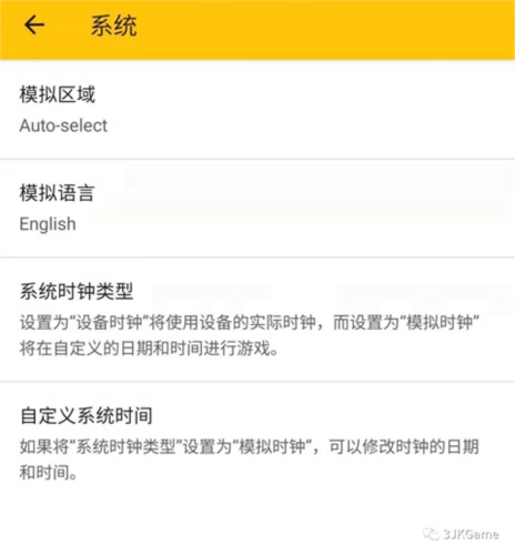 模拟区域选择自动模式就行,模拟器的语言能设为中文,而且这里还可以调整游戏里的虚拟时间。