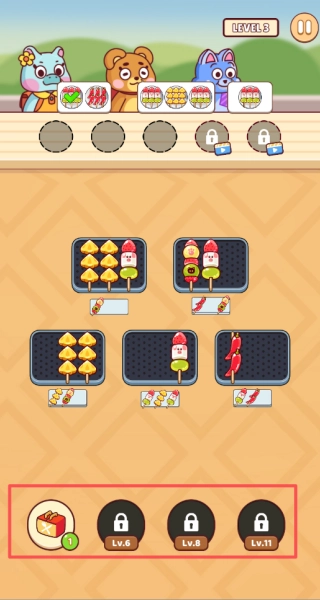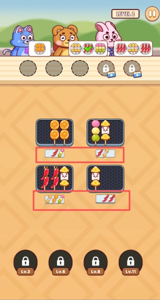 1、点击选中同类型的烤串,把三个相同的烤串移到相邻的位置就能完成消除。