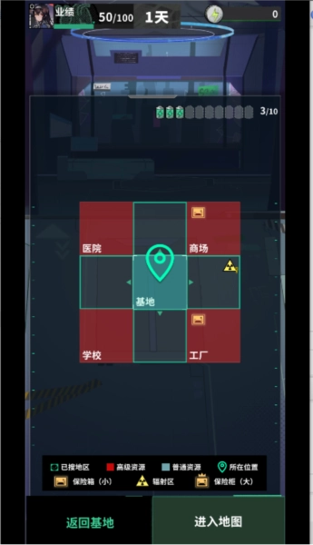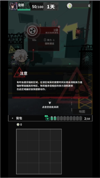 有时会遇到辐射区域,在这类区域停留搜索的时间越长,体力值消耗就越大;辐射等级越高的地方,物资往往越丰富,但体力消耗的速度也会相应更快。所以在这种区域,最好加快搜索节奏。