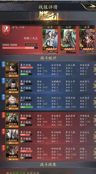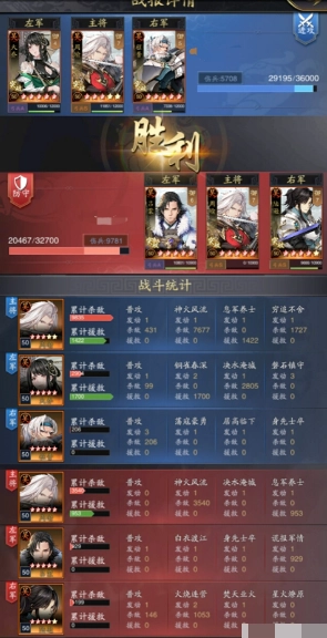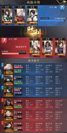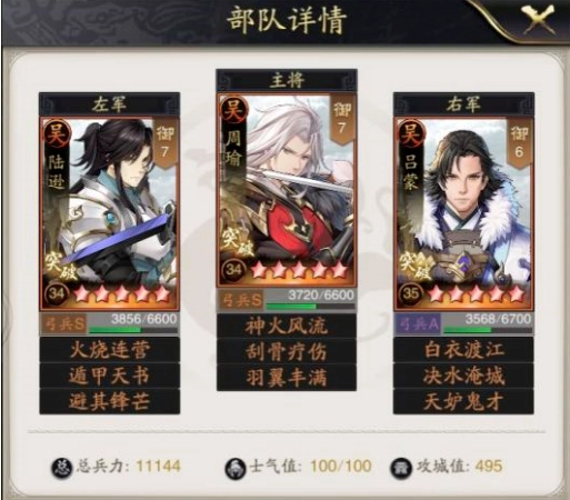 对于平民和低氪玩家来说,这一队还是很不错的选择,统御较低,大乔和程普相对爆率较高,技能搭配方面大乔铜雀春深配合周瑜锁定敌方主将输出,治疗配合上程普的减伤能够抗住敌方的伤害,周瑜带【息军养士】【穷追不舍】保证生存和输出;大乔【决水淹城】【磐石镇守】在补足输出的同时为主将周瑜提供高强度减伤buff;程普带【居高临下】【身先士卒】全方位加强周瑜的输出,周瑜利用6次神火风流很容易将对方主将秒杀,取得胜利。