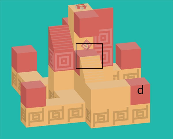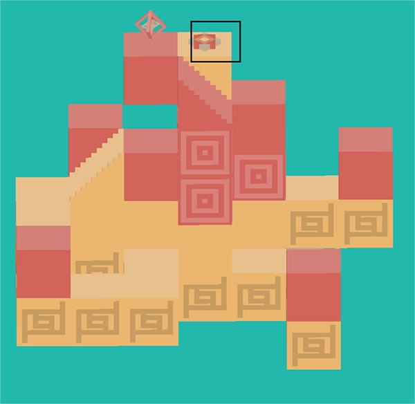 请将画面按照图示方向调整角度,然后切换到二维视图模式,接着把视角向上移动到更高一层的红色区域。